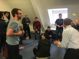 ATR entwickelt schon seit mehreren Jahren erfolgreich mit inzwischen 2 Teams nach den agilen Prinzipien Software. Die Schulung diente teils als Auffrischung und für neue Mitarbeiter als Einführung in SCRUM. Während der 2 Tage wurde von den beiden Coaches die Entwicklung in der SW Entwicklung vom Wasserfall Modell hin zu den agilen Methoden skizziert. Ausgehend von Gedanken der Lean Factory bei Toyota, bei der Begriffe wie Kaizen (kontinuierliche Verbesserung), Muda (Verschwendung), Muri (Überlastung) und Mura (Unausgewogenheit) eine Rolle spielen, über die ersten agilen Ansätze von Kent Becks XP (Extreme Programming) führte der Weg hin zum agilen Manifest und den 12 agilen Prinzipien. Die sehr spannenden Ausführungen der beiden SCRUM Coaches wurden nach der jeweiligen Mittagspause unterbrochen von ersten praktischen Übungen zum agilen Vorgehen. Insbesondere das Ball Point Game veranschaulichte auf spielerische Art die Wirkungsweise des SCRUM Prinzips und bereitete der gesamten Mannschaft viel Spaß.