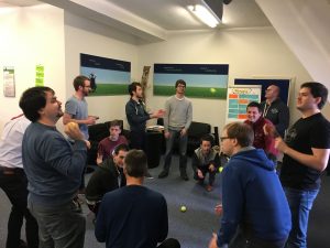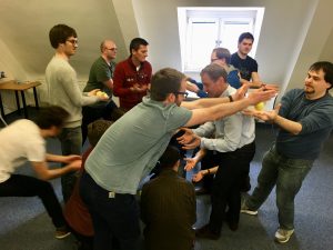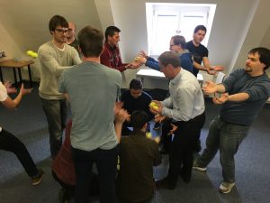 ATR entwickelt schon seit mehreren Jahren erfolgreich mit inzwischen 2 Teams nach den agilen Prinzipien Software. Die Schulung diente teils als Auffrischung und für neue Mitarbeiter als Einführung in SCRUM. Während der 2 Tage wurde von den beiden Coaches die Entwicklung in der SW Entwicklung vom Wasserfall Modell hin zu den agilen Methoden skizziert. Ausgehend von Gedanken der Lean Factory bei Toyota, bei der Begriffe wie Kaizen (kontinuierliche Verbesserung), Muda (Verschwendung), Muri (Überlastung) und Mura (Unausgewogenheit) eine Rolle spielen, über die ersten agilen Ansätze von Kent Becks XP (Extreme Programming) führte der Weg hin zum agilen Manifest und den 12 agilen Prinzipien. Die sehr spannenden Ausführungen der beiden SCRUM Coaches wurden nach der jeweiligen Mittagspause unterbrochen von ersten praktischen Übungen zum agilen Vorgehen. Insbesondere das Ball Point Game veranschaulichte auf spielerische Art die Wirkungsweise des SCRUM Prinzips und bereitete der gesamten Mannschaft viel Spaß.