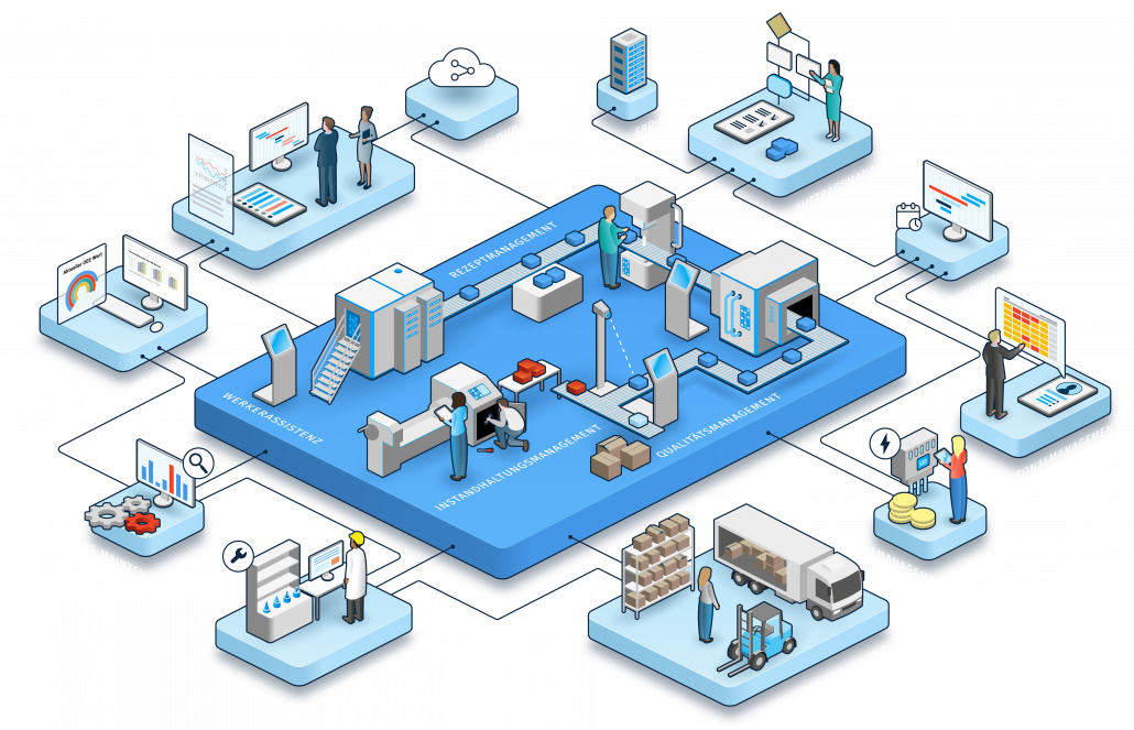 Mit dem zentralen Produktionscockpit haben Sie Zugriff auf alle relevanten Kennzahlen und Informationen und können Produktionsprozesse überwachen, steuern sowie gezielt optimieren. Dabei werden Daten aus den verschiedenen Modulen der Plattform intelligent mit den Daten anderer Systeme wie zum Beispiel Vorgabezeiten aus dem ERP verknüpft.